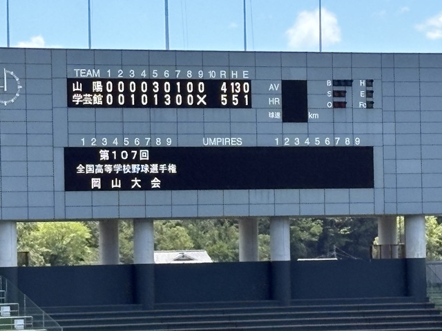 高校野球選手権岡山県大会決勝。岡山学芸館高校野球部は5−4でおかやま山陽高校を下して2年連続4回目の夏の甲子園出場が決定!!野球部の皆さんおめでとうございます!