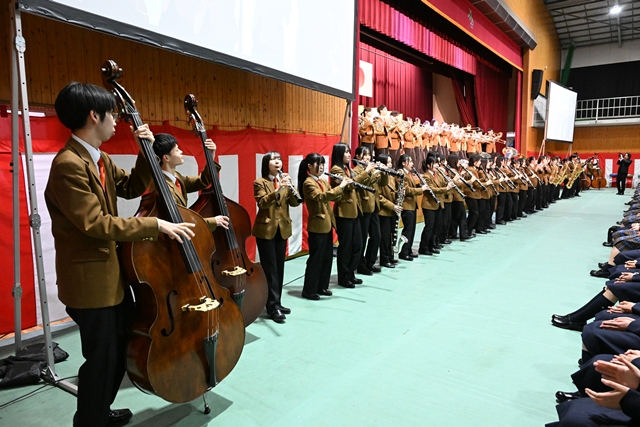 桜舞う中、令和8年度の入学式が挙行されました。吹奏楽部は式後の行事で歓迎演奏をさせていただきました。